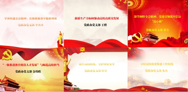 在“党员微党课”环节,李卉卉、王骋、董方、金炜皓、杜登、朱杰分别以《学深悟透全会精神,在精准服务中提质增效》《新质生产力如何驱动高校高质量发展》《深学细悟全会精神,党建引领筑牢信访“连心桥”》《一体推进教育科技人才发展与师范高校担当》《筑牢高校防线,守护国家安全》《守好高校机要保密工作防线》为题,汇报了对党的二十届四中全会精神的学习情况,结合本职岗位和工作分享了学习体会。